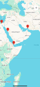 サウジアラビアもホルムズ海峡使っているのですが、サウジアラビアは逆サイドも使えます。左にピンが打ってあるヤンブーという港からバブエルマンデル海峡を通ってアラビア海に出るパターンです。ヤンブーまではパイプラインで送ります。